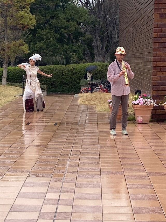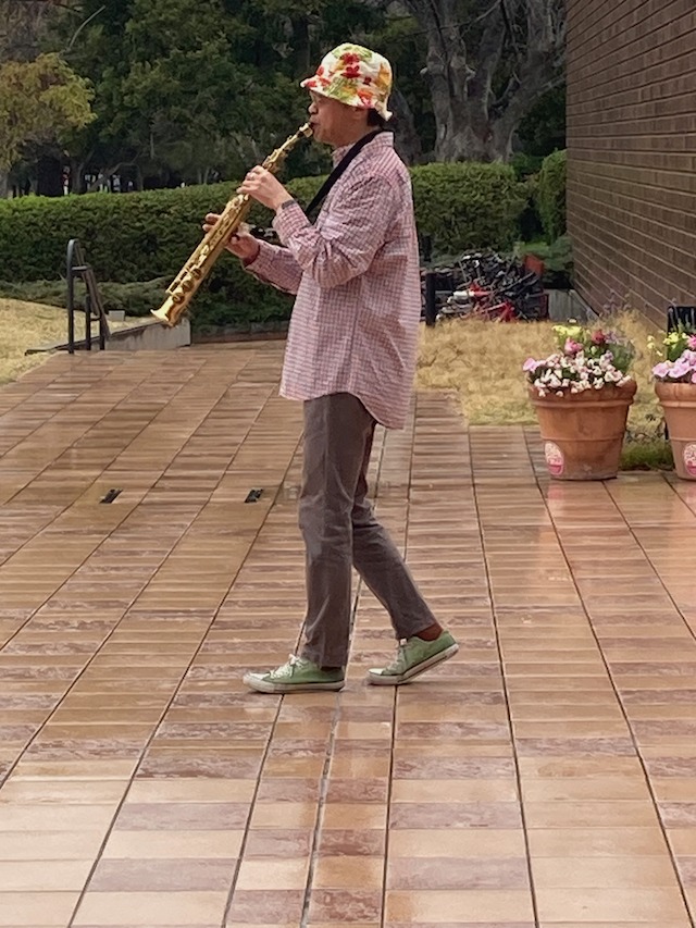 午後は、残念ながら雨の中でのパフォーマンスとなりましたがそれでもサックスの音の響きは広がりを持ち、雨にも負けないように空中に放つことができたように思います。